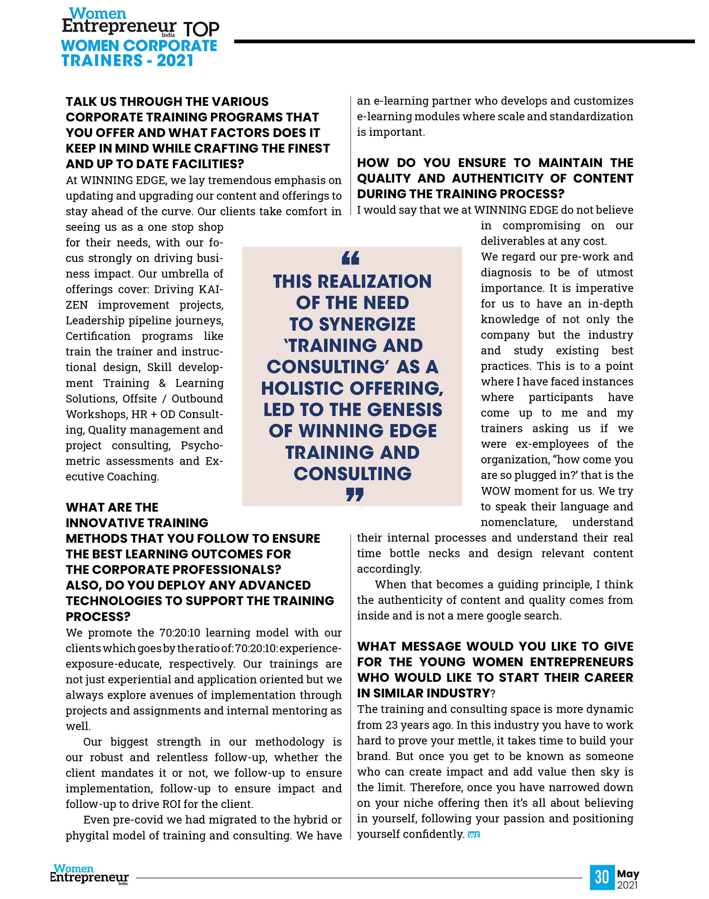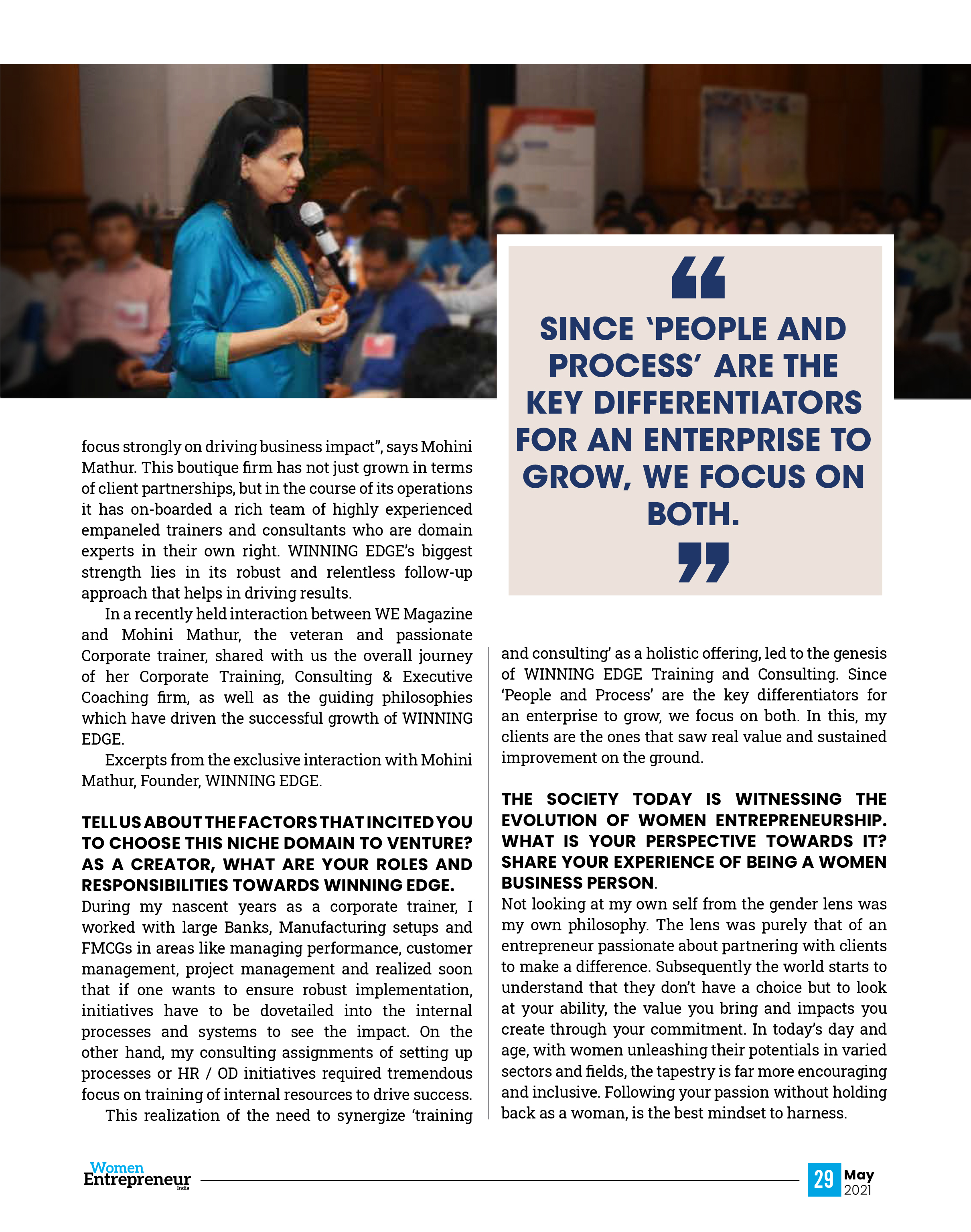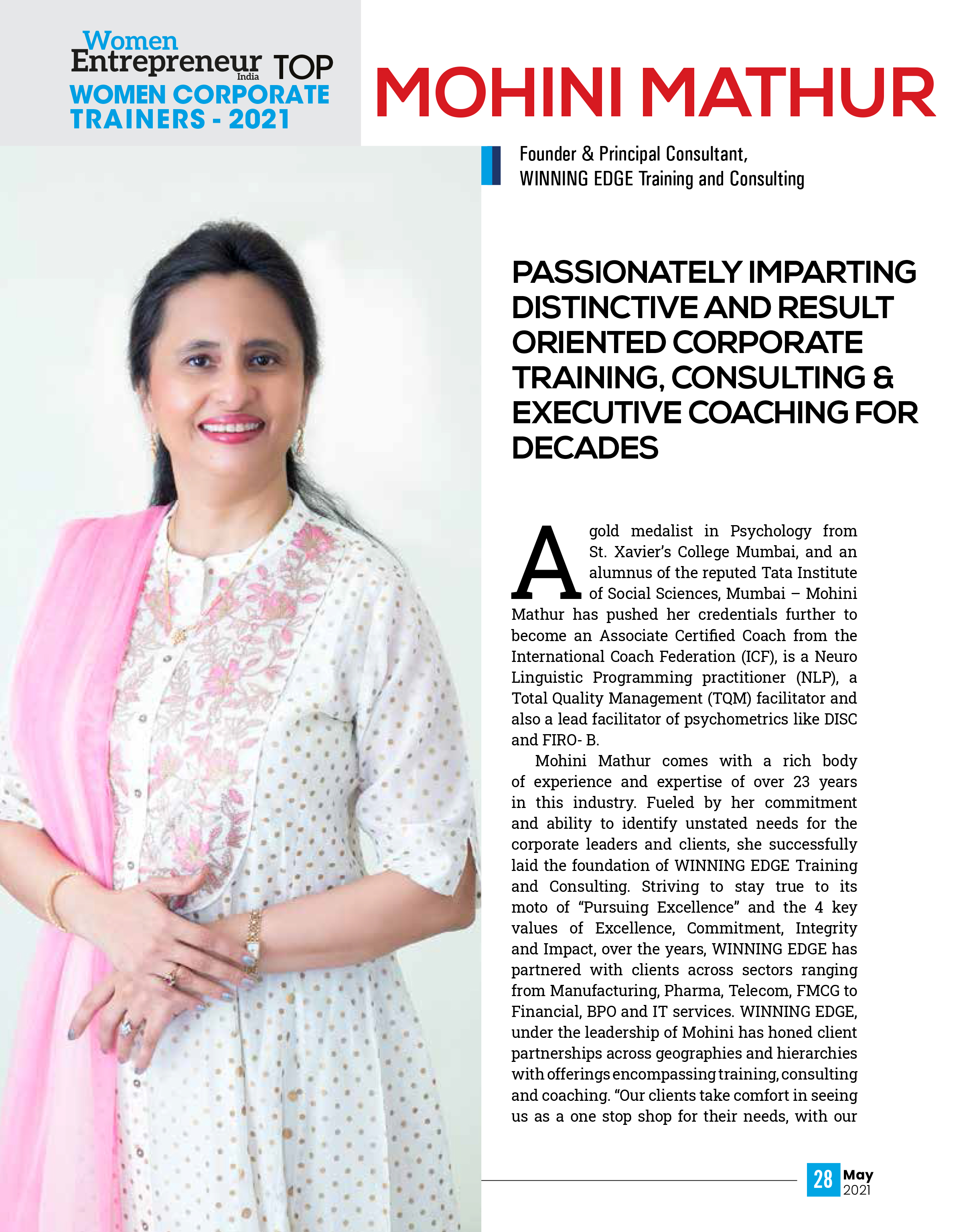 Mohini was recognized as one of the 'Top 10 Women Corporate Trainers' by an Independent team from the Women Entrepreneur India, Women In Business' forum in 2021.